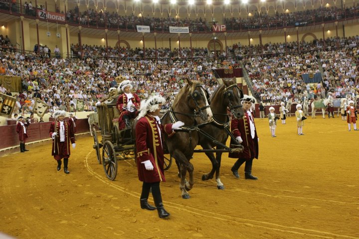 Entram na arena, seis charameleiros, que tocam uma espécie de cornetin e um timbaleiro que toca tambor e tímbalos. Apresentam-se vestidos a rigor e são eles que abrem o espectáculo, dando-lhe pompa e circunstância.